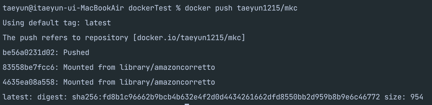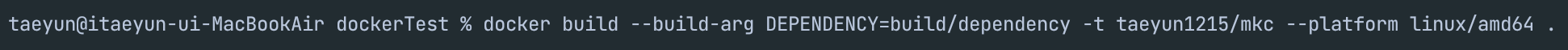 - docker build --build-arg DEPENDENCY=build/dependency -t taeyun1215/mkc --platform linux/amd64 . → . 까지 넣어줘야한다. taeyun1215/mkc부분은 dockhub ID/docker repo이다.
