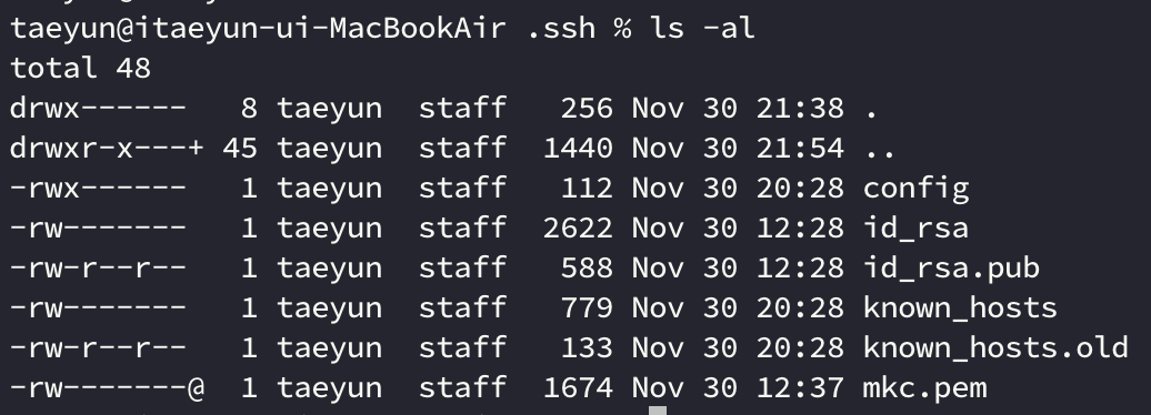 - ssh-keygen 명령어를 입력하여 ssh key가 /User/taeyun/.ssh 폴더에 생성된다.