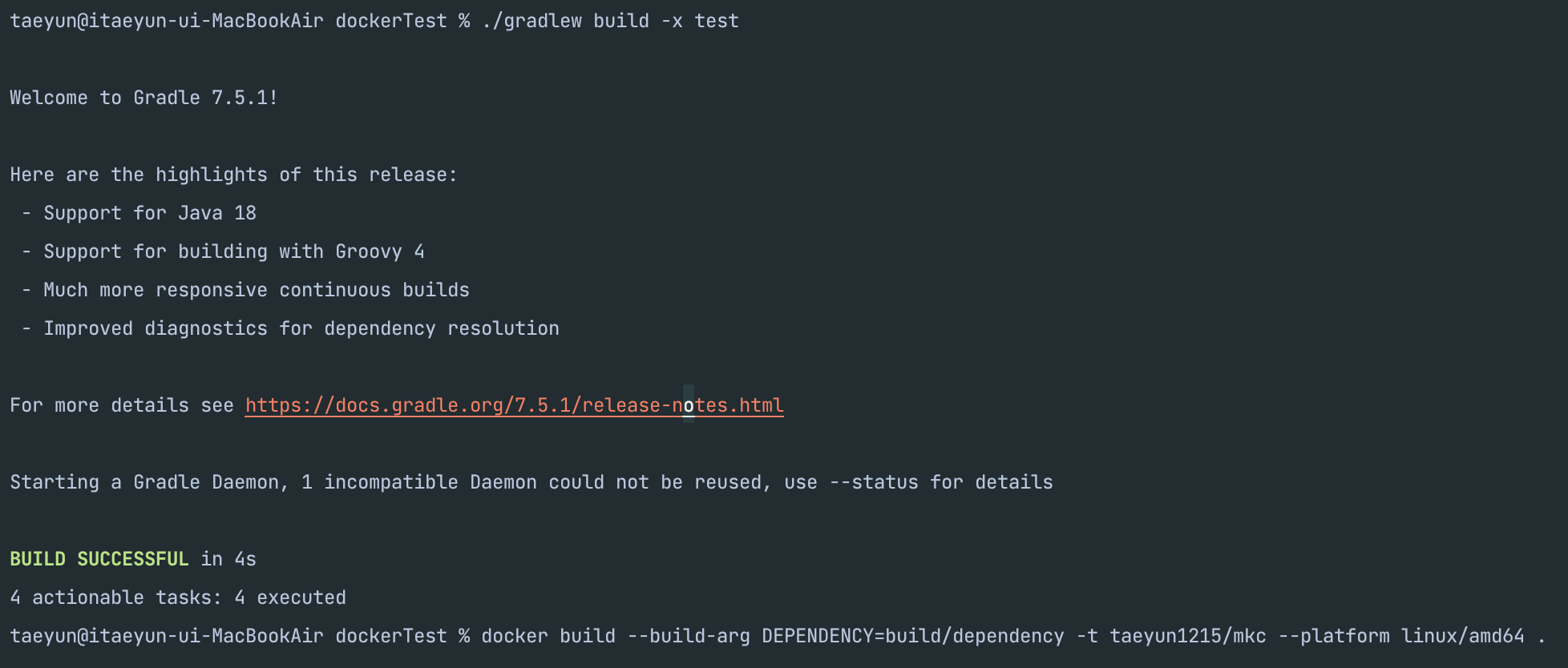 - docker build --build-arg DEPENDENCY=build/dependency -t taeyun1215/mkc --platform linux/amd64 . → . 까지 넣어줘야한다. taeyun1215/mkc부분은 dockhub ID/docker repo이다.