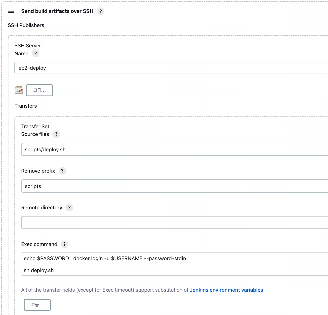 - 또한 받은 코드 중 deploy.sh 파일을 jenkins에 설정한 운영용 EC2 서버로 전송하고 실행을 한다.