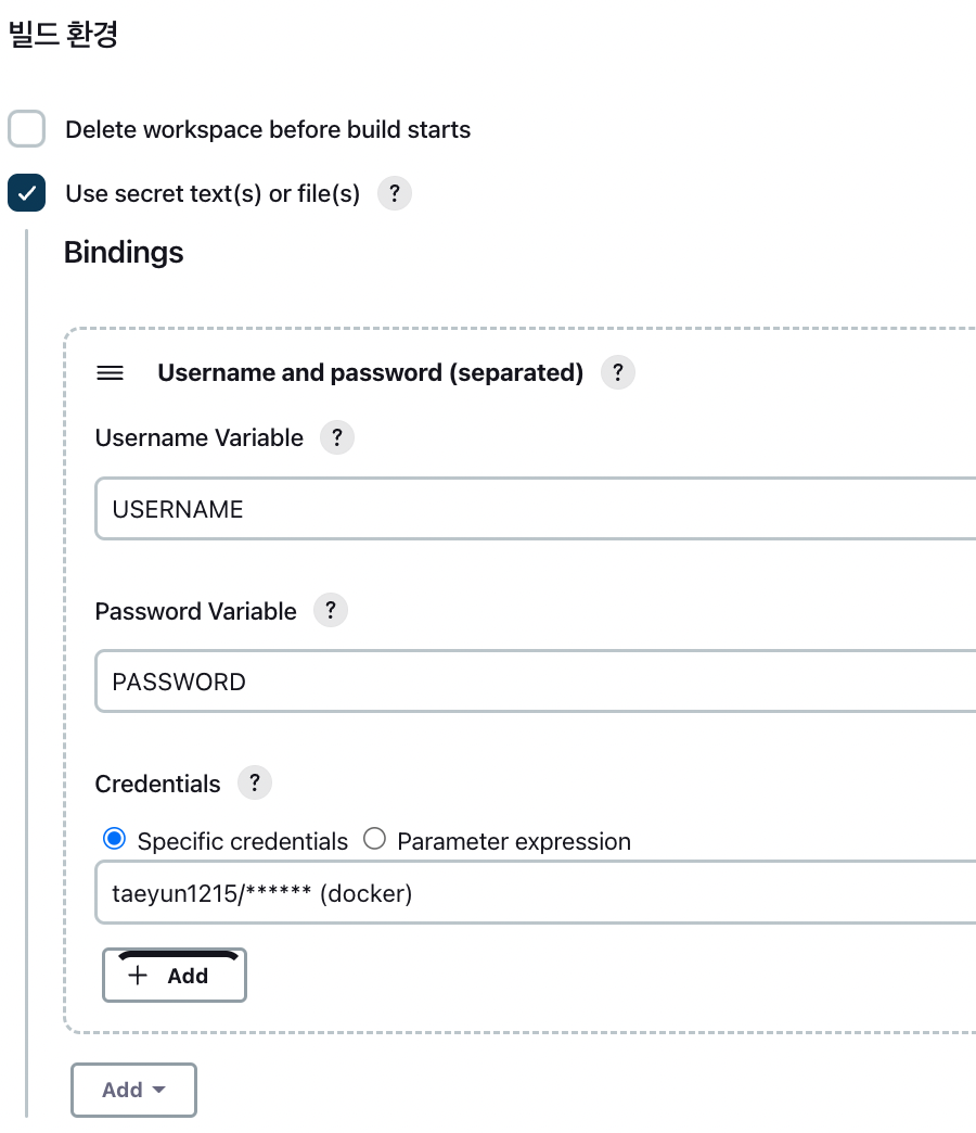 - 각각 Variable에 Username으로 사용할 변수명, Password로 사용할 변수명을 지정해주고 Credentials에 specific credentials을 선택하고 전에 만들어놓았던 Dockerhub 계정을 선택합니다.