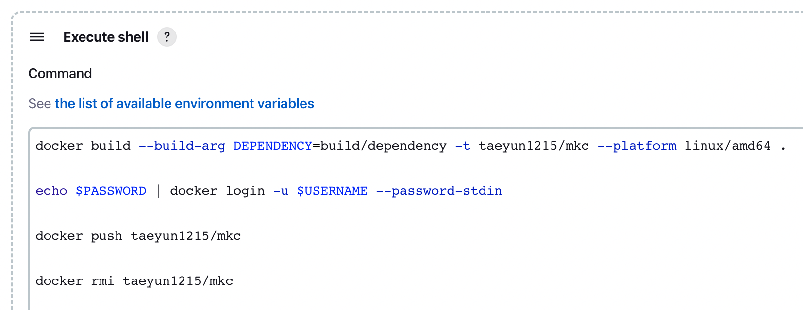 # 도커파일 이미지를 빌드합니다. docker build --build-arg DEPENDENCY=build/dependency -t taeyun1215/mkc --platform linux/amd64 . # 도커 로그인을 시도합니다. $변수명 을 이용하면 위에서 작성한 변수명으로 값을 사용할 수 있습니다. echo $PASSWORD | docker login -u $USERNAME --password-stdin # 도커허브에 빌드된 이미지를 푸시합니다. docker push taeyun1215/mkc # 푸시한 이미지를 삭제합니다. docker rmi taeyun1215/mkc # 참고 # taeyun1215/mkc -> 도커 계정 ID/도커 레파지토리 명으로 두면 된다. # 위 부분은 처음에 작성한 script/depoly.sh에서 사용할 명이니 참고해야한다.