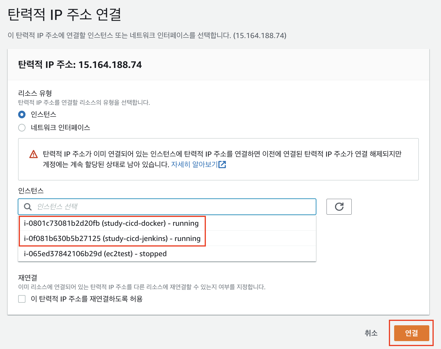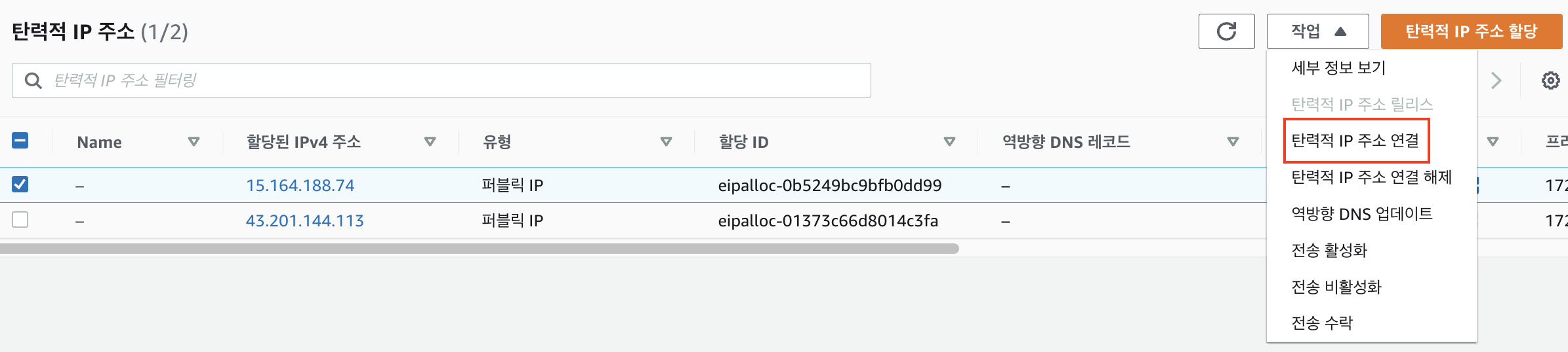 4. 탄력적 IP를 기존에 만들어 두었던 두개 EC2에 연결하면 된다. → 탄력적 IP 주소 연결을 클릭한다.