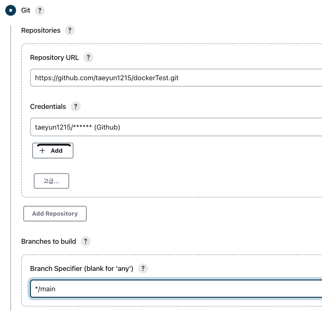 - Credentials → 전에 Github 계정 정보를 만들어 두었던 Credentials를 선택한다.