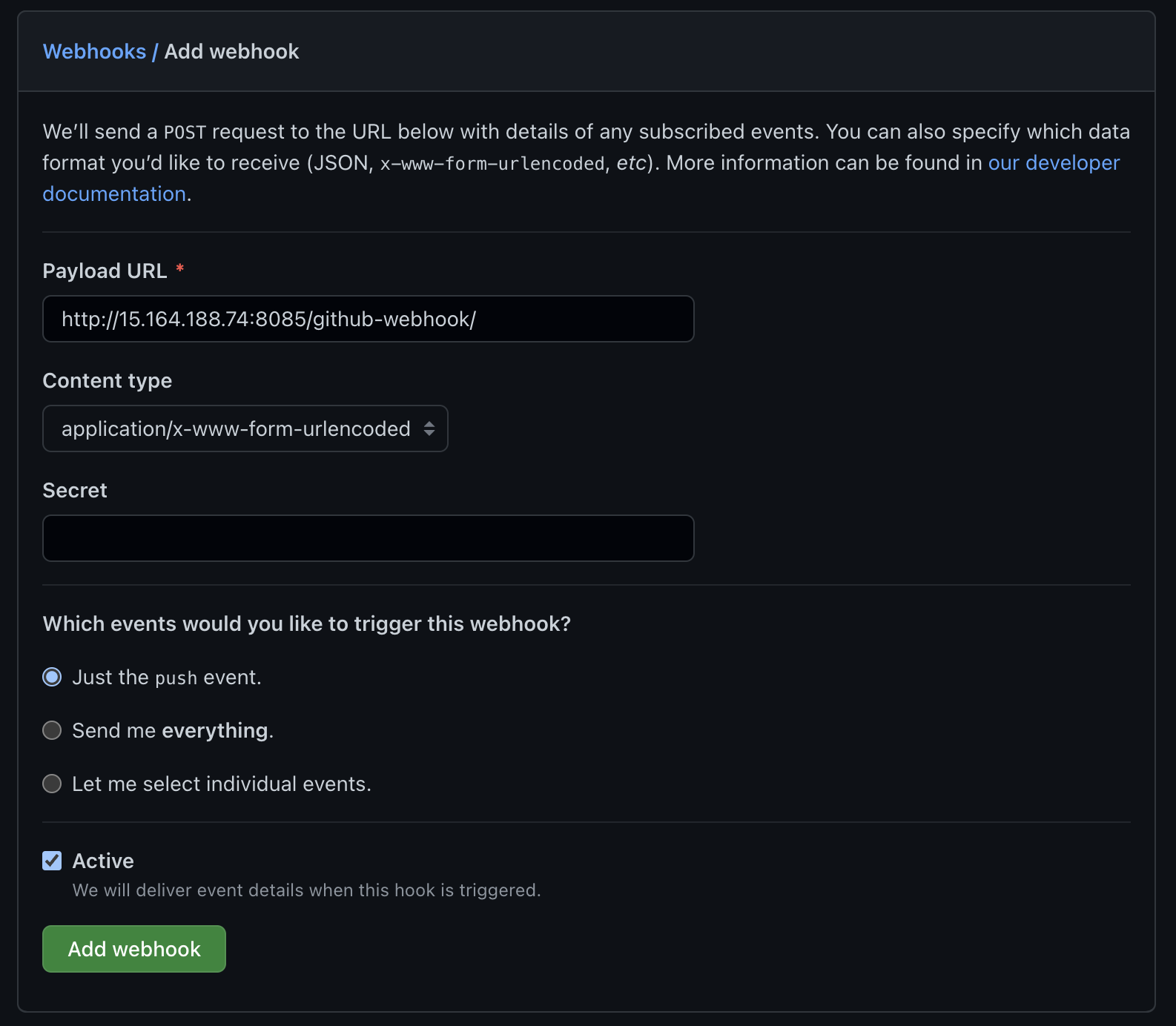 - Payload URL → http://JenkinsEC2의탄력적IP/github-webhook/를 입력한다.