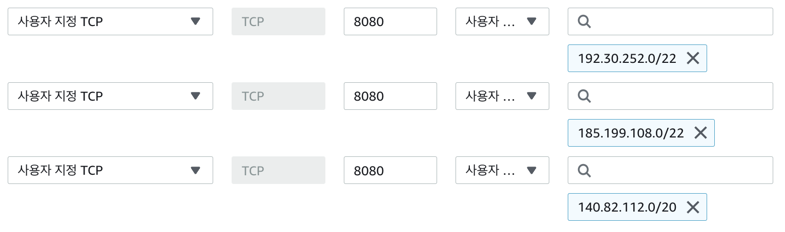 - Github의 web hook IP 허용 작업을 해야한다. 이 작업은 Jenkins EC2 보안 그룹을 수정해야한다.