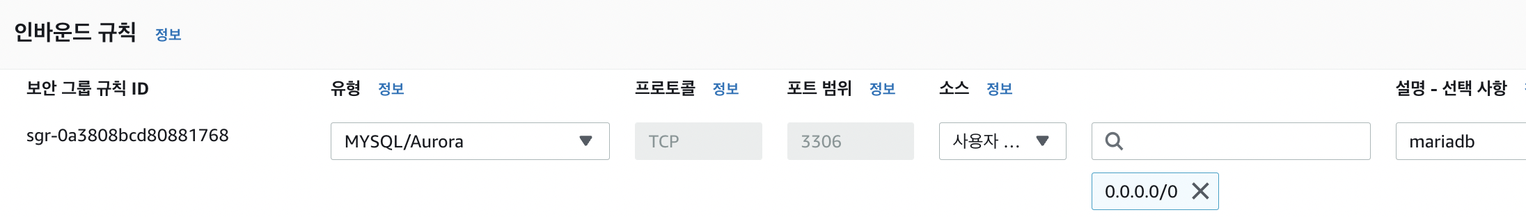 - 소스 → 전체 허용(0.0.0.0/0)