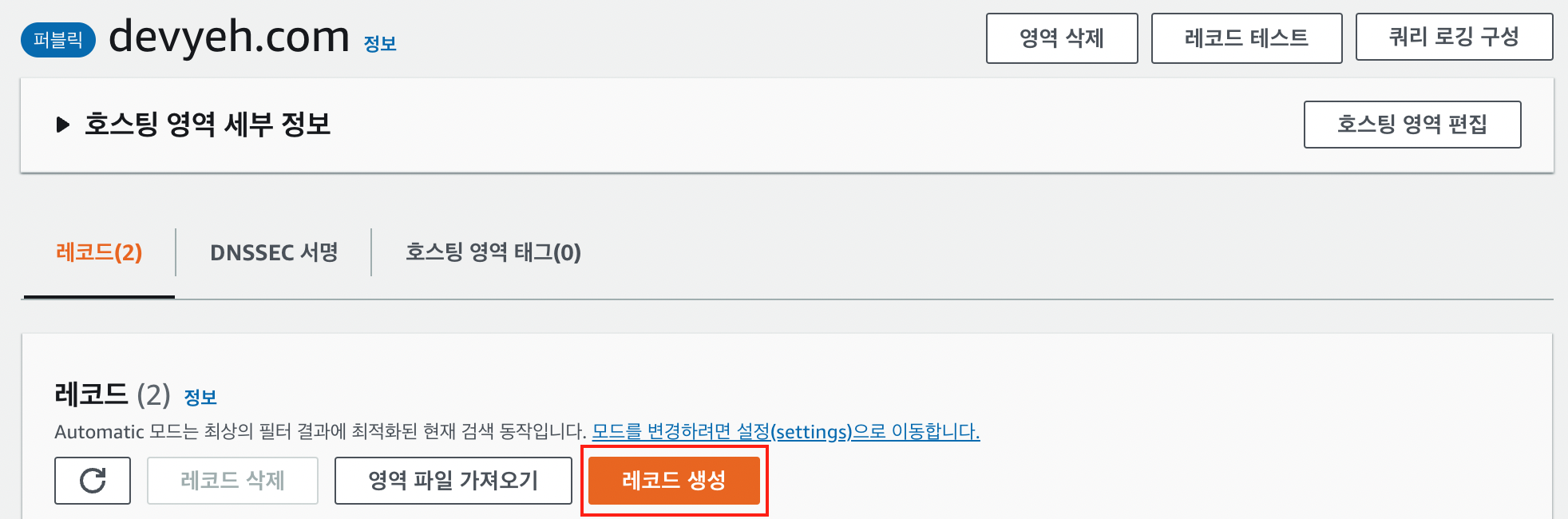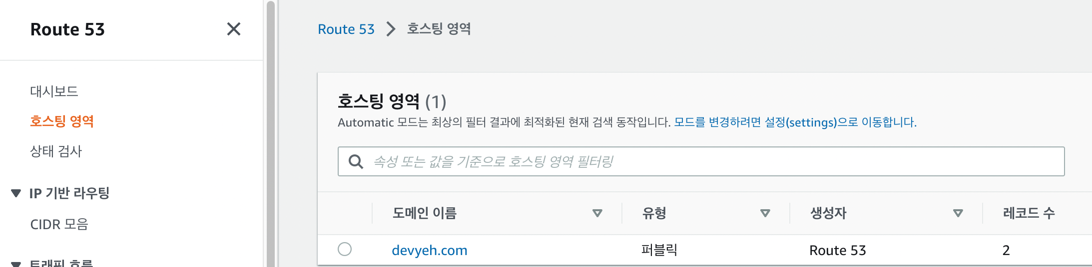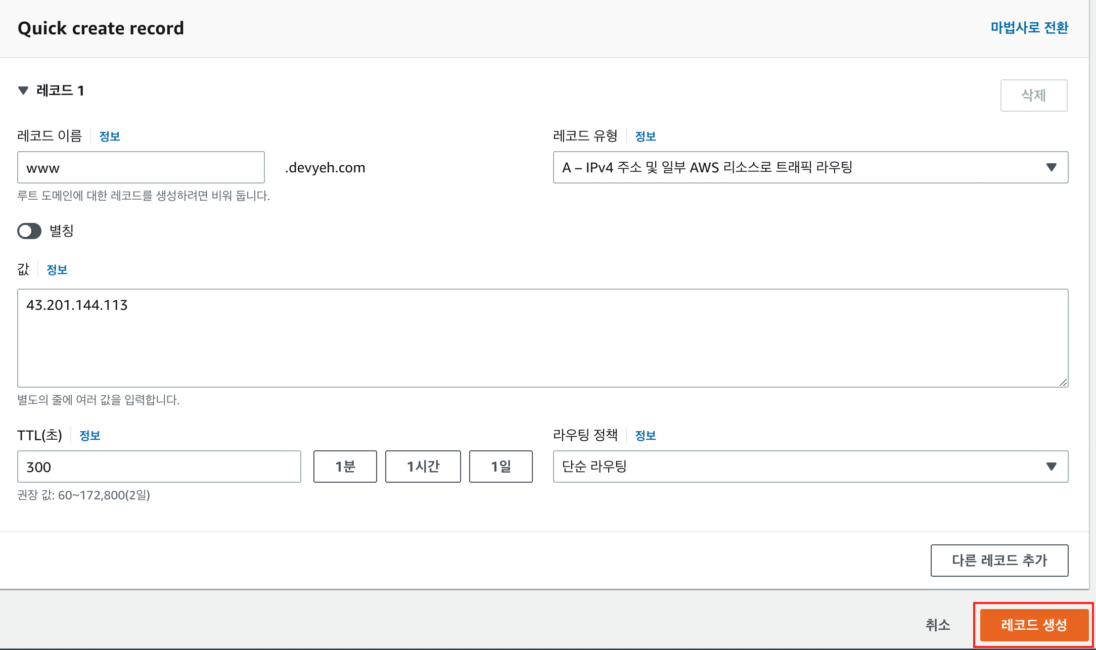 - 레코드 유형 → 여러가지 레코드 유형이 있는데 A 레코드(IPv4 주소를 사용하여 웹 서버와 같은 리소스로 트래픽을 라우팅 하는 역할)를 사용하였다.