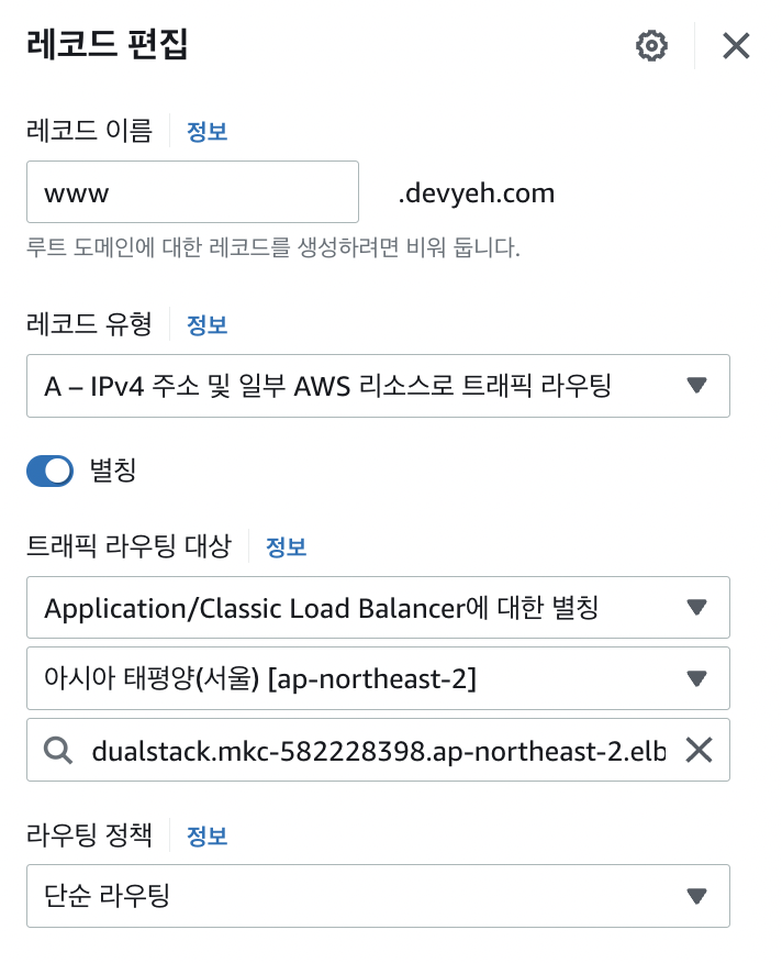 - 트래픽 라우팅 대상 중 Application/Classic Load Balancer에 대한 별칭을 선택한다.