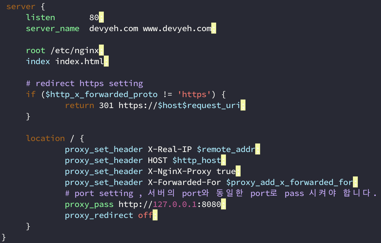 - location → 위 4줄은 고정이고 나머지 2줄 중 proxy_pass는 실행하는 포트와 동일한 포트를 사용해야한다. 나는 springboot를 8080포트로 받기에 저렇게 적용했다.